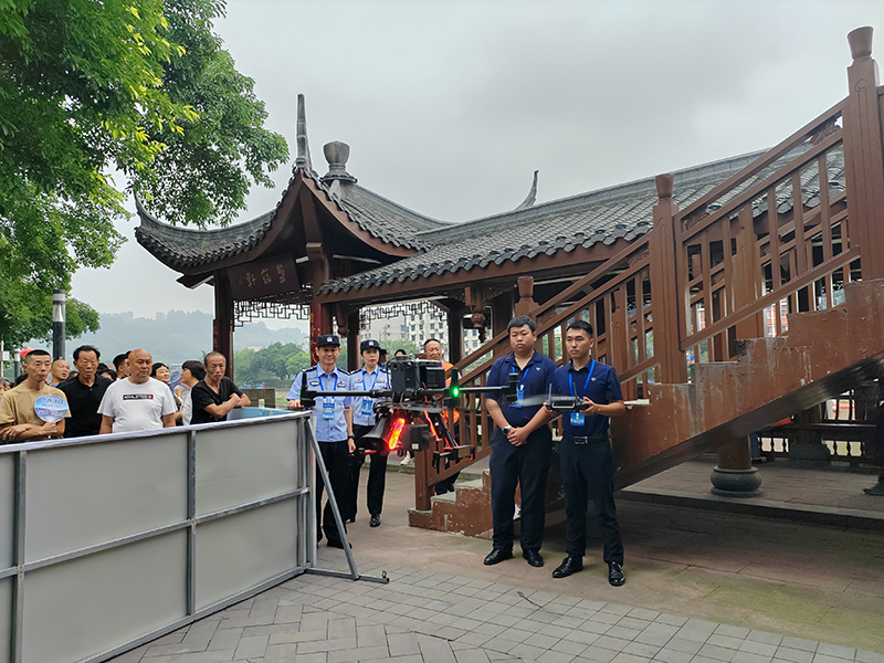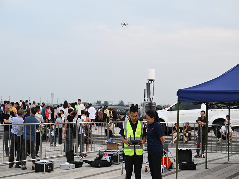 在低空无人机巡防工作中,航空服务分公司政务飞行团队充分发挥行业无人机的优势,搭载广播探照灯、长焦及红外热成像镜头、红蓝爆闪灯等多功能模块执行立体化巡防任务。对人群密集区进行低空安全巡查喊话与警示,及时疏导人群,保障活动现场人员流动安全有序;活动现场画面实时回传指挥中心,为指挥调度提供数据支撑;单兵无人机协助完成关键区域巡查及影像数据采集,为公安宣传留存大量高清素材。
