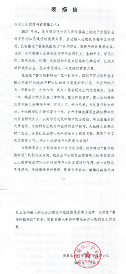 2026年1月5日,四川三汇安防科技有限公司收到峨眉山市公安局治安管理大队发来的表扬信,信中对我公司派驻的峨眉守押大队在“警保联勤联动”工作中的突出表现给予高度肯定。