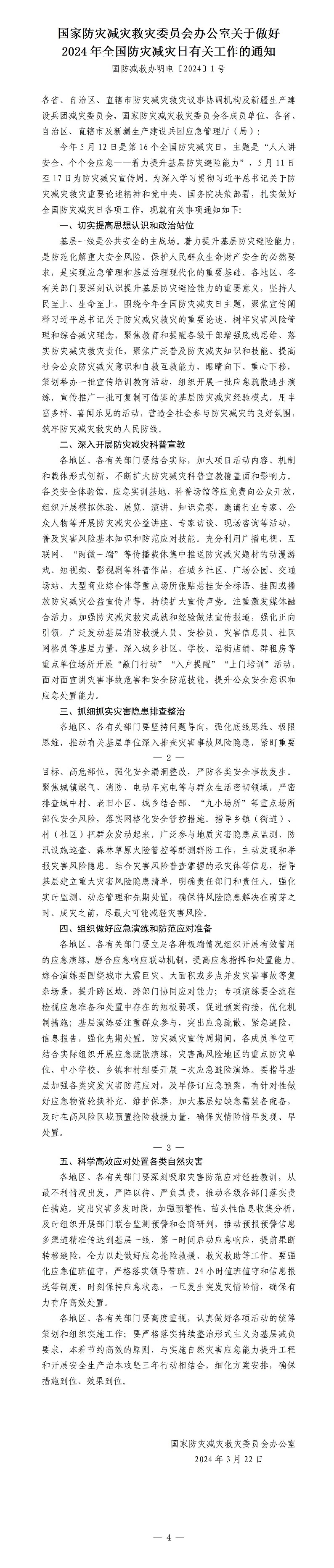 国家防灾减灾救灾委员会办公室关于做好2024年全国防灾减灾日有关工作的通知