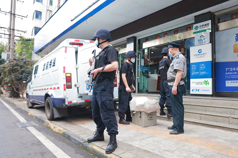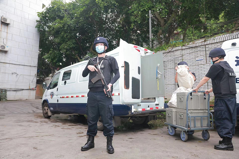 交接完毕,确保钞箱和封包进入银行安全区域后,两名解款员迅速上车,随后两名持枪守押员上车,运钞车又抓紧时间驶向下一网点。