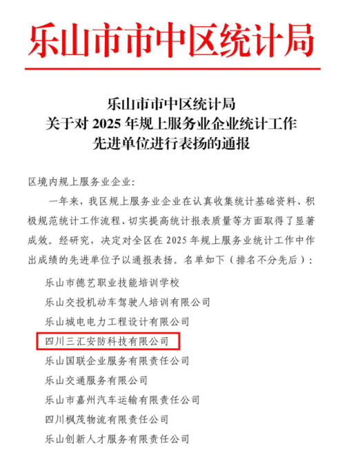 近日,乐山市市中区统计局发布表彰通报,四川三汇安防科技有限公司凭借规范高效的统计工作表现,成功获评“2025年规上服务业企业统计工作先进单位”称号,这是主管部门对公司统计工作专业性与严谨性的高度认可。