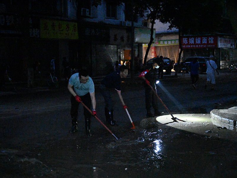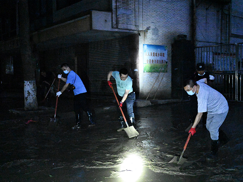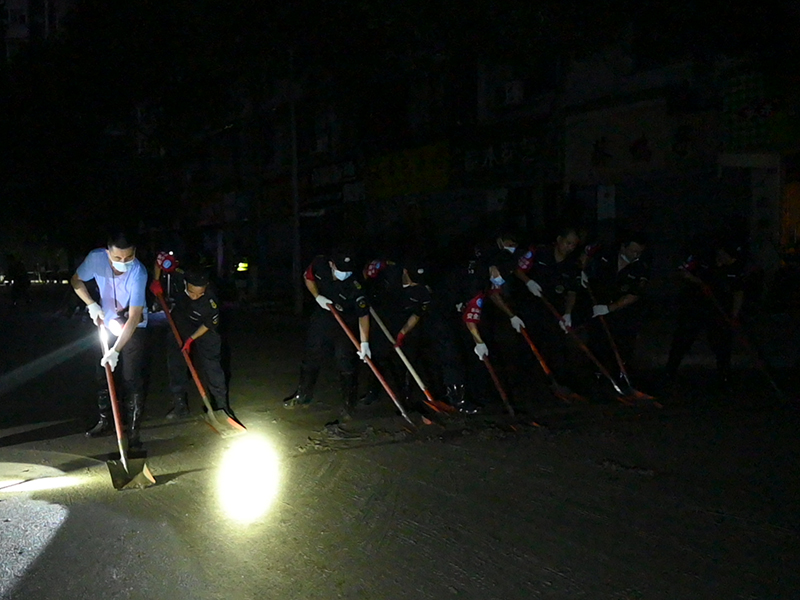 晚7时,参与清淤的公司员工整齐地扛起铁锹、扫帚等工具赶到受灾最为严重的王浩儿街,与社区相关工作人员碰头确定了清淤路段。此时的天空已经很暗,员工们打开随身斜背着的强光手电筒,手拿铁锹一锹一锹地将泥浆、淤泥聚拢并铲上工程车。当晚的清淤工作一直持续到22日凌晨,完成既定清淤任务的员工们这才“收兵”。