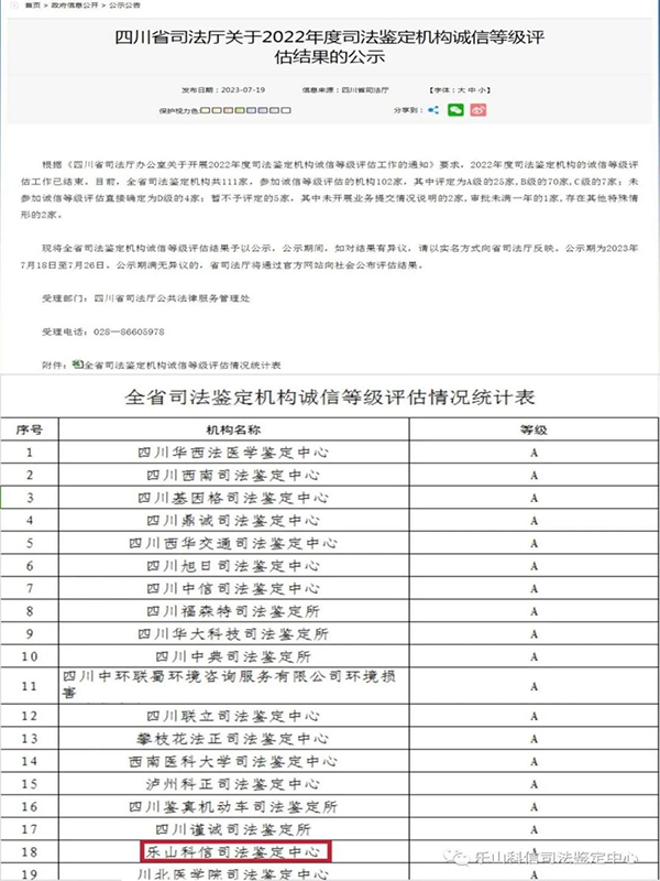 近期,四川省司法厅发布2022年度司法鉴定机构诚信等级评估结果,其中公司科信司法鉴定中心获评“诚信等级A级”。