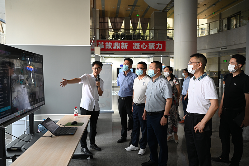 来到中国电信乐山分公司一楼大厅,董事长黄成勇、副总经理王军、鄢志远首先参观了电信公司自主研发的魔镜监控系统、I乐山平台、云主机以及定制5G展示。