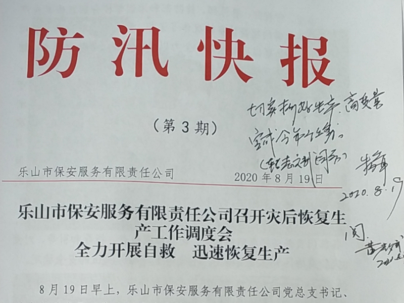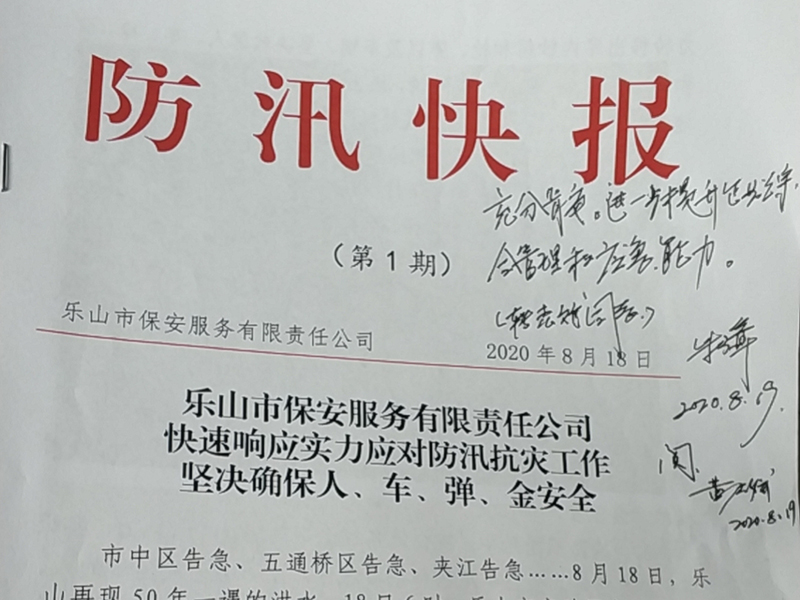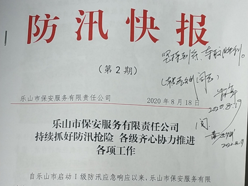 8月19日,乐山市国资委党委副书记、主任朱璋在乐山市保安服务有限责任公司呈报的三期《防汛快报》上作出批示,高度肯定保安公司在此次防大汛、抗大洪、救大灾中的应急举措和突出表现,并对企业下一步的工作目标任务提出具体要求。