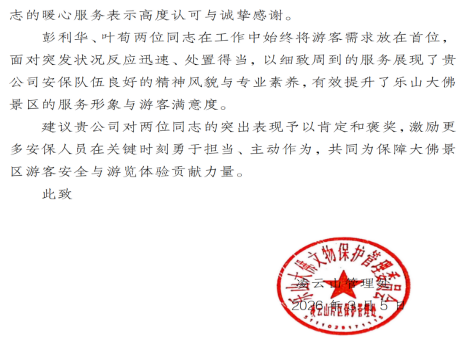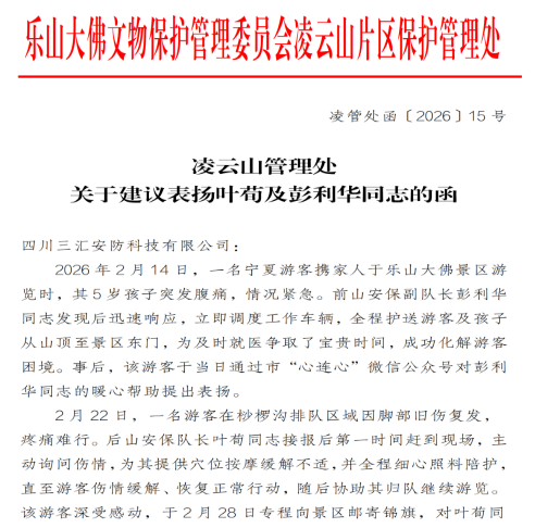近日,乐山大佛文物保护管理委员会凌云山片区保护管理处致函四川三汇安防科技有限公司,对公司派驻景区的安保人员彭利华、叶荀两名同志提出表扬,肯定他们在执勤期间主动救助遇险游客、用心守护游客安全的责任担当,以实际行动展现了国企安保队伍的优良作风,赢得景区管理方与游客的高度认可。