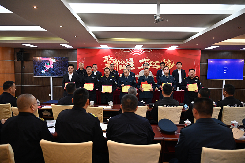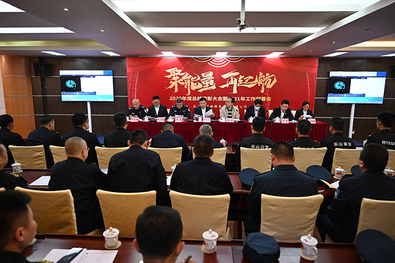 董事长黄成勇主持会议。会议观看了乐山市保安公司《2020年汇报总结片——蹄疾步稳 劈波奋进》,总经理阳家明对公司2020年各项工作进行了总结回顾;副总经理王军宣读了《公司2020年度受市级以上部门表彰情况的通报》;副总经理鄢志远宣读了《公司2020年度考核与评优评先考核评选结果的通报》;并现场为2020年度先进集体和先进个人代表获得者颁发了荣誉证书。