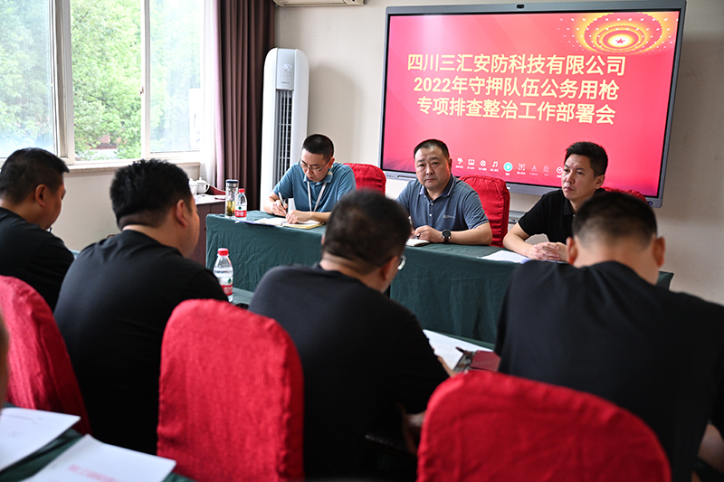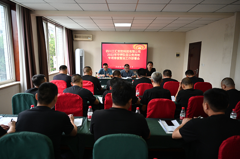 为进一步加强和规范公务用枪管理工作,严格落实枪支安全管理制度和监管责任,坚决防止公务用枪案件发生,为党的二十大胜利召开创造安全稳定的政治社会环境,近日,公司召开公务用枪专项排查整治工作部署会。董事长黄成勇、副总经理王军,以及守押部相关负责人、各守押大队大队长参加会议。