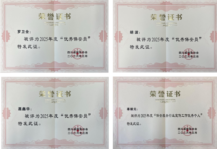 凭借规范的服务管理、突出的行业贡献和优质的宣传工作成效,公司被四川省保安协会授予2025年度“优秀保安服务公司”和“保安服务行业宣传工作优秀集体”两项荣誉称号。同时,公司保安队员罗卫全、胡波和聂鑫华凭借扎实的业务能力、恪尽职守的工作作风和优异的履职表现,获评2025年度“优秀保安员”;员工辜毅元荣获2025年度“保安服务行业宣传工作优秀个人”。